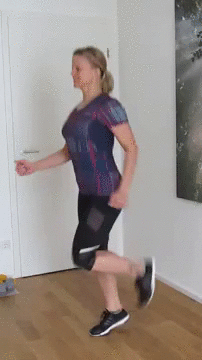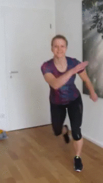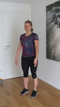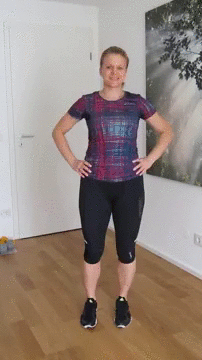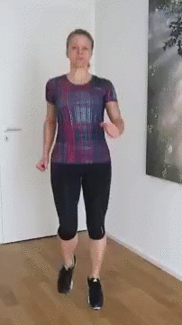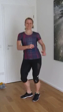 Öffne die Füße weiter als schulterweit und beug die Knie leicht. Mach schnelle Fußbewegungen, wobei der Oberkörper möglichst stabil bleibt. Da das die letzte Übung ist, kannst du hier richtig Fahrt aufnehmen und den Puls nach oben treiben.