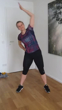 Öffne die Füße weiter als schulterweit, zieh die Arme im Wechsel über Kopf zur anderen Seite und öffne dabei deine Körperseiten.